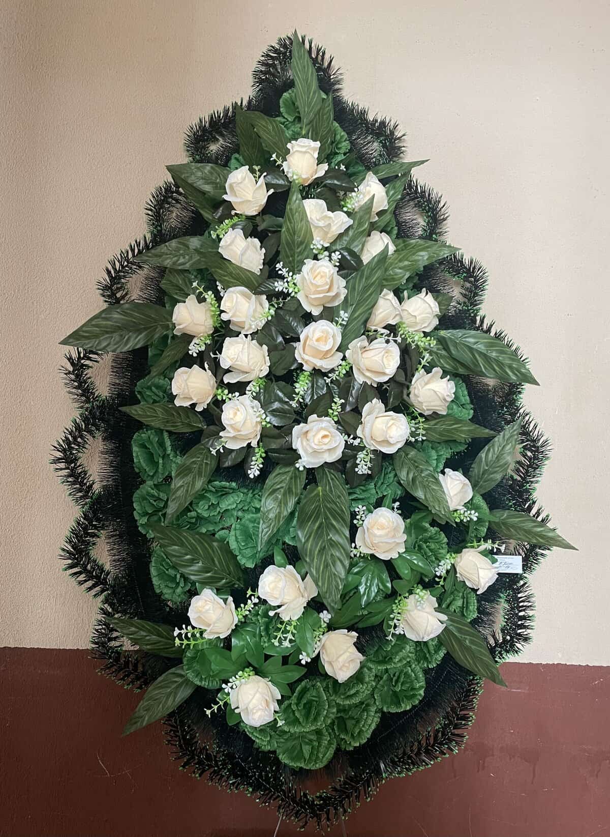 • Венок В14 — траурный ритуальный венок из белых роз и зелени. Идеально подходит для церемоний и памят.